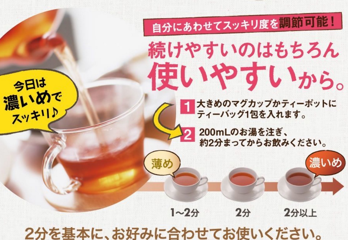 お茶を濃く出すために煮出すことはおやめ下さい。桃花スリムの中の成分が壊れてしまう可能性があるためオススメできません。
